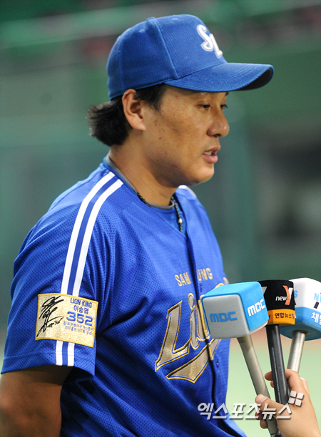 통산 최다홈런 352개를 달성한 삼성 이승엽이 금빛으로 된 로고와 '352'와 사인을 새겨진 패치를 부착한 유니폼을 입고 인터뷰를 하고 있다.