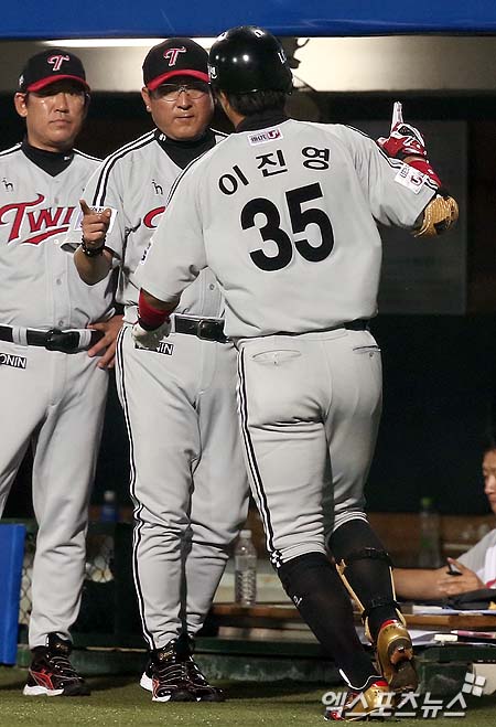 [엑스포츠뉴스 = 대구, 김성진 기자] 21일 오후 대구 시민운동장 야구장에서 열린 '2013 한국야쿠르트 세븐 프로야구' 삼성 라이온즈와 LG 트윈스의 경기에 LG 김기태 감독이 7회 초 무사 솔로홈런을 터뜨린 이진영과 하이파이브를 하고 있다.