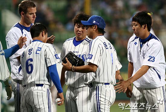 [엑스포츠뉴스 = 대구, 김성진 기자] 21일 오후 대구 시민운동장 야구장에서 열린 '2013 한국야쿠르트 세븐 프로야구' 삼성 라이온즈와 LG 트윈스의 경기에 8회 초 1사 1,3루 위기에서 강판된 윤성환이 동료들의 박수를 받으며 덕아웃으로 오고 있다.