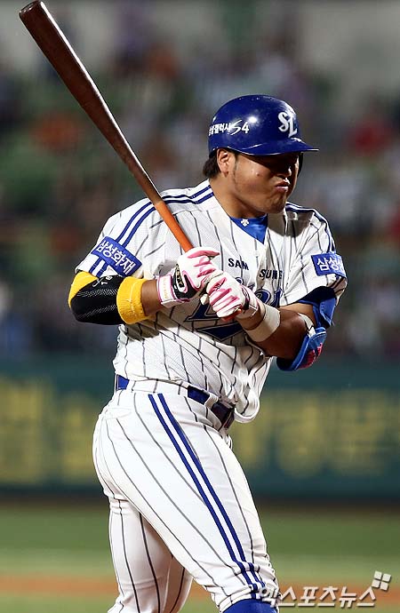 [엑스포츠뉴스 = 대구, 김성진 기자] 21일 오후 대구 시민운동장 야구장에서 열린 '2013 한국야쿠르트 세븐 프로야구' 삼성 라이온즈와 LG 트윈스의 경기에 9회 말 1사 1,2루 박석민이 몸에 맞은 볼로 출루하고 있다.