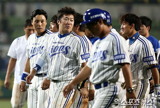 패배한 삼성 선수들이 팬들에게 인사 후 그라운드를 빠져나가고 있다.