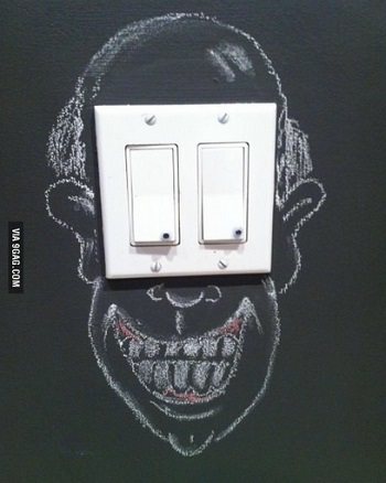 이 스위치의 아래쪽에는 눈동자가 그려져 있으며 두 개의 스위치 주위로 사람 얼굴 모양이 그려져 있다. 이 때문에 마치 이 스위치가 음흉하게 아래쪽을 내려다 보는 것처럼 보인다.