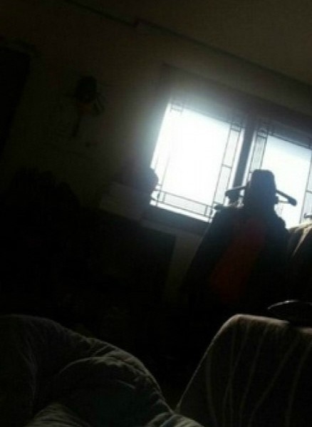 사진을 보면 햇볕이 들어오는 창가에 갓을 쓴 듯한 형체가 보인다. 마치 '전설의 고향'에 등장하는 저승사자와 비슷한 모양이다.