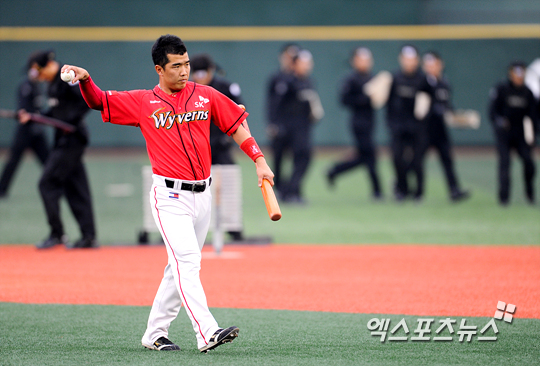[엑스포츠뉴스=권혁재 기자] 25일 오후 서울 양천구 목동야구장에서 열린 '2013 한국야쿠르트 세븐 프로야구' 넥센 히어로즈와 SK 와이번스의 경기, 경기에 앞서 6.25 한국전쟁 60주년을 맞이해 경찰 특공대가 특공무술 시범을 보이는 가운데 SK 정근우가 경기를 준비하고 있다.