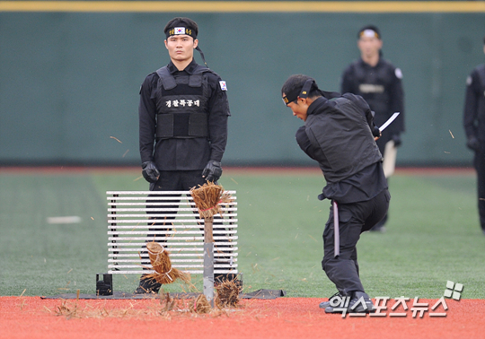 [엑스포츠뉴스=권혁재 기자] 25일 오후 서울 양천구 목동야구장에서 열린 '2013 한국야쿠르트 세븐 프로야구' 넥센 히어로즈와 SK 와이번스의 경기, 경기에 앞서 6.25 한국전쟁 60주년을 맞이해 경찰 특공대가 특공무술 시범을 보이고 있다.
