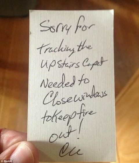 이 쪽지에는 "화기가 집안으로 들어오는 것을 막기 위해 카펫으로 창문을 막아야 했다"라며 "위층의 카펫을 망가뜨려 미안하다"는 내용이 적혀있다.
