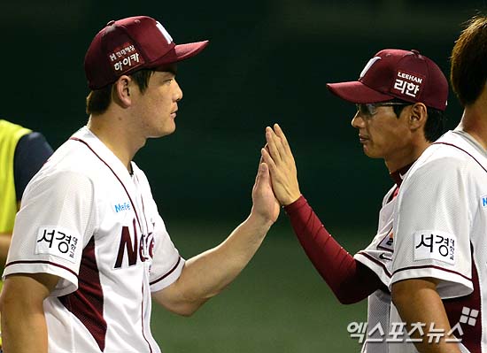 넥센 염경엽 감독(오른쪽)이 3점 홈런을 친 이성열과 하이파이브를 하고 있다.
