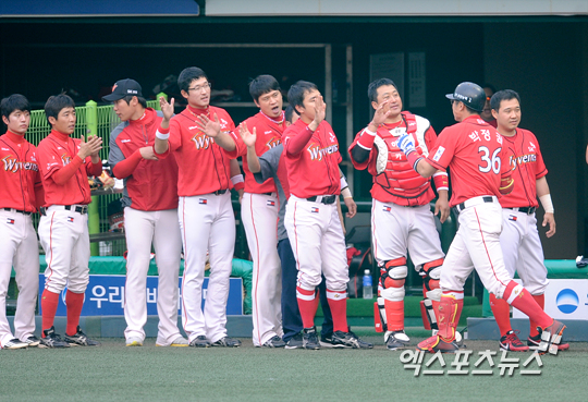 [엑스포츠뉴스=권혁재 기자] 27일 오후 서울 목동야구장에서 열린 '한국 아쿠르트 세븐 프로야구' 넥센 히어로즈와 SK 와이번스의 경기, 1회초 1아웃 1, 2루 SK 박정권이 우월 3점포를 날리고 들어와 동료들의 축하를 받고 있다.