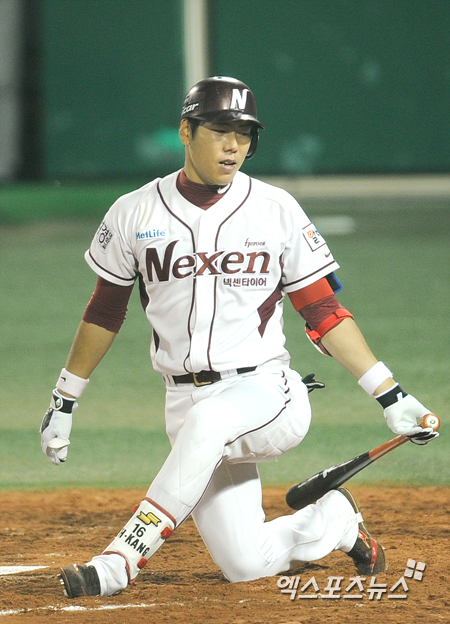 [엑스포츠뉴스=권혁재 기자] 27일 오후 서울 목동야구장에서 열린 '한국 아쿠르트 세븐 프로야구' 넥센 히어로즈와 SK 와이번스의 경기, SK가 6-2로 앞선 7회말 1아웃 넥센 강정호가 크게 헛스윙을 하고 타석에 주저앉아 있다.