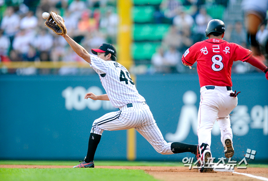 [엑스포츠뉴스=권혁재 기자] 28일 오후 서울 송파구 잠실야구장에서 열린 '2013 한국야쿠르트 세븐 프로야구' LG 트윈스와 SK 와이번스의 경기, 1회초 LG 1루수 문선재가 3루 땅볼을 친 SK 정근우를 포스 아웃 시키고 있다.
