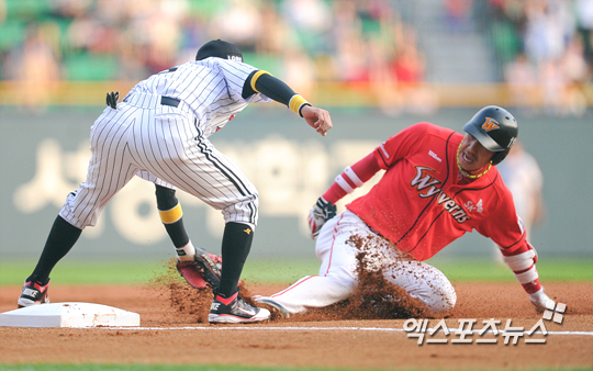 [엑스포츠뉴스=권혁재 기자] 28일 오후 서울 송파구 잠실야구장에서 열린 '2013 한국야쿠르트 세븐 프로야구' LG 트윈스와 SK 와이번스의 경기, 2회초 2아웃 1루 SK 김강민이 1타점 적시 2루타를 날리고 공이 홈으로 송구되는 사이 3루까지 쇄도 슬라이딩 태그아웃 당하고 있다.