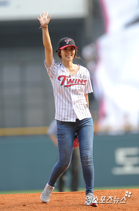 [엑스포츠뉴스=권혁재 기자] 29일 오후 서울 송파구 잠실야구장에서 열린 '2013 한국야쿠르트 세븐 프로야구' LG 트윈스와 SK 와이번스의 경기, 방송인 박지윤이 시구를 마치고 관중들은 향해 손을 흔들고 있다.