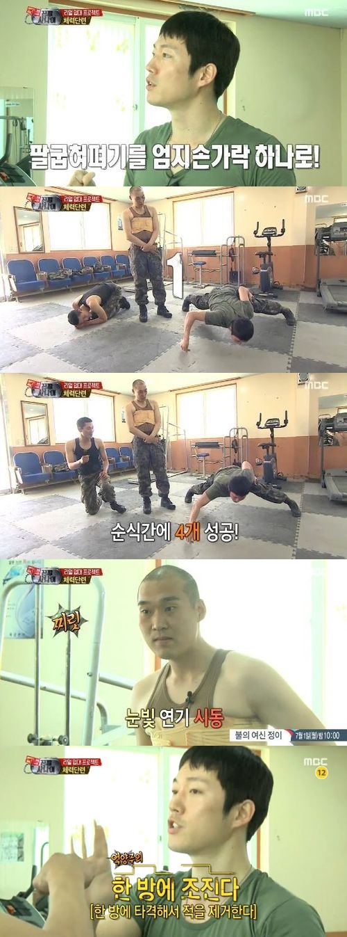 이날 방송에서 일반적인 맨손 운동으로 몸을 푼 이들은 푸시업 내기를 했다. 장혁은 "한 손으로 푸시업을 하는 사람은 흔하다. 하지만 혹시 엄지손가락으로만 푸시업을 하는 사람을 본 적이 있느냐"고 운을 뗐다.