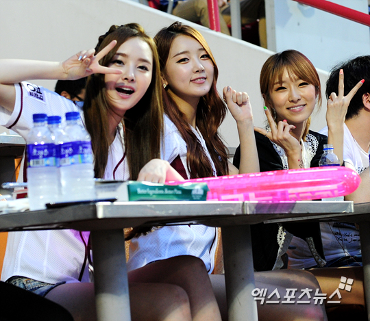 [엑스포츠뉴스=권혁재 기자] 9일 오후 서울 양천구 목동야구장에서 열린 '2013 한국야쿠르트 세븐 프로야구' 롯데 자이언츠와 넥센 히어로즈의 경기, 시구와 시타를 마친 달샤벳 멤버 수빈과 우희 그리고 뒤늦게 야구장에 도착한 가은이 관중석에 앉아 경기를 관람하고 있다.
