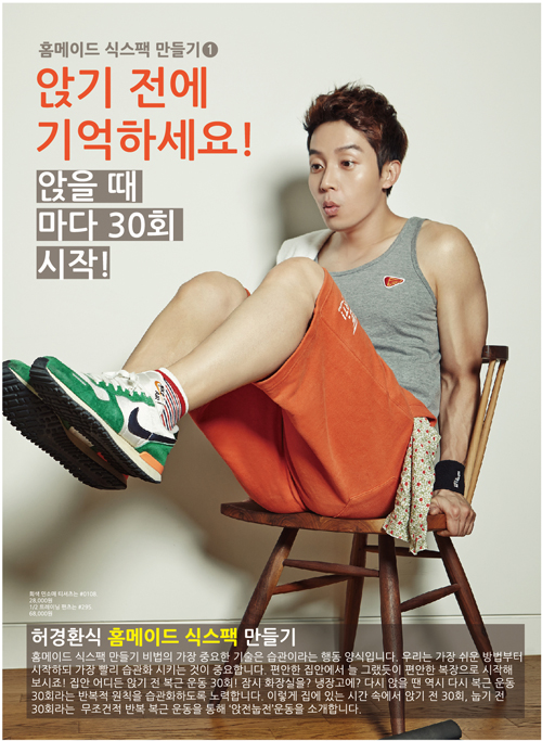 화보 속 허경환은 세면대, 집 안 어디서든, 쉴 새 없이 운동하고 있는 모습을 보여주며, 집에서도 쉽게 따라 할 수 있는 홈메이드 식스팩 운동법을 제안한다.