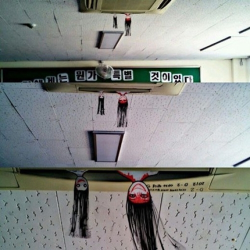 이런 괴기한 그림과 함께 에어컨 바람에 종이가 휘날리는 모습이 마치 거꾸로 매달린 채 머리를 휘날리는 귀신의 모습과 흡사해 보는 사람으로 하여금 섬뜩하게 한다.