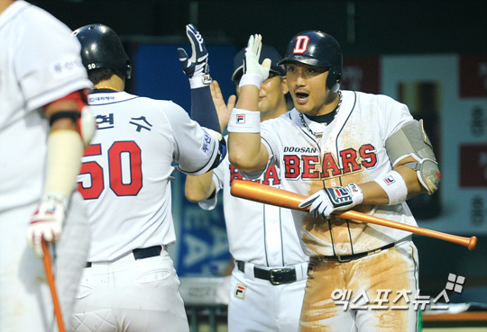 [엑스포츠뉴스=권혁재 기자] 13일 오후 서울 송파구 잠실야구장에서 열린 '2013 한국야쿠르트 세븐 프로야구' KIA 타이거즈와 두산 베어스의 경기, 두산이 3-0으로 앞선 5회말 1아웃 1, 3루 두산 홍성흔이 우월 3점포를 날린 김현수와 특유의 폼으로 세리머니를 하고 있다.