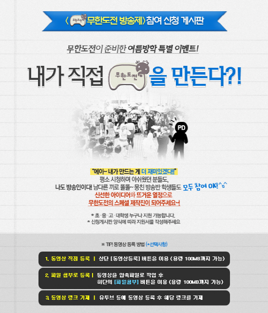 여름방학을 겨냥해 진행하는 이벤트인 만큼 지원 대상자를 학생으로만 제한하며, 현재 방송 분야에서 활동하고 있는 아마추어 방송인이나 평소 '무한도전'을 시청하며 제작에 직접 참여해보고 싶었던 학생들이라면 누구나 지원이 가능하다.
