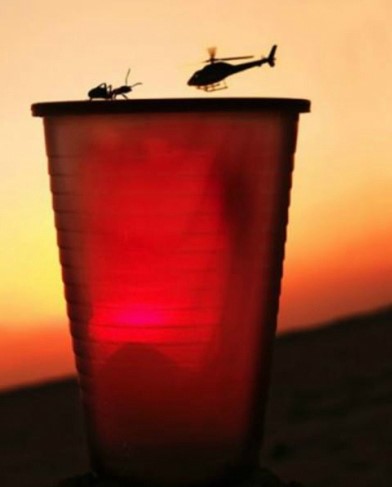 해당 사진은 원근법을 이용해 종이컵 위에 있는 개미를 멀리 지나가는 헬리콥터와 비슷한 크기로 보이게 각도를 조절해 촬영한 것으로 알려졌다.
