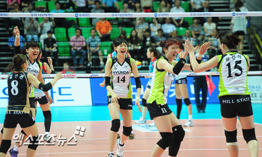 [엑스포츠뉴스=안산, 권혁재 기자] 20일 오후 안산 상록수체육관에서 열린 '2013 안산·우리카드컵 프로배구대회' 개막전 여자부 GS칼텍스와 현대건설의 경기, 현대건설 김진희의 서브 득점에 성공하자 선수들이 기뻐하고 있다.