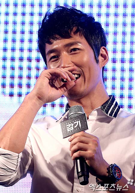 [엑스포츠뉴스 = 김성진 기자] 22일 오후 서울 강남구 논현동 플래툰 쿤스트할레에서 열린 영화 ‘감기’ 뮤직 쇼케이스에 MC 박경림이 장혁에게 랩을 요구하자 쑥스러운 미소를 짓고 있다.