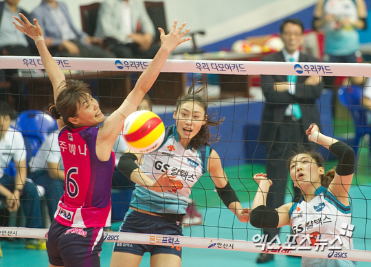 [엑스포츠뉴스=안산, 권혁재 기자] 24일 오후 안산 상록수체육관에서 열린 '2013 안산·우리카드컵 프로배구대회' 여자부 흥국생명과 GS칼텍스의 경기, GS 배유나가 흥국생명 주예나의 블로킹보다 빠르게 속공 플레이를 펼치고 있다.