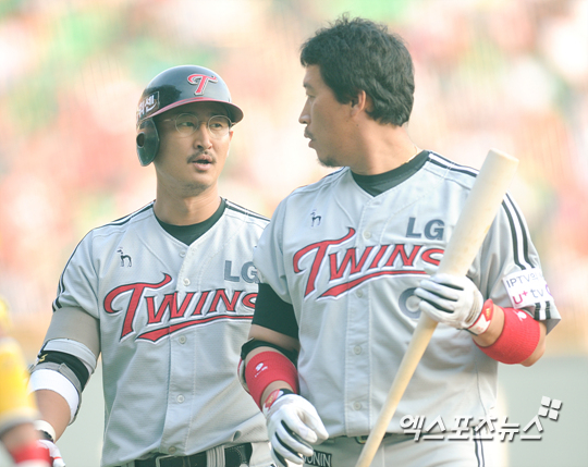 [엑스포츠뉴스=권혁재 기자] 26일 오후 서울 송파구 잠실야구장에서 열린 '2013 한국야쿠르트 세븐 프로야구' LG 트윈스와 두산 베어스의 경기, 1회초 선두타자 LG 박용택이 우월 솔로포를 날리고 들어와 이병규와 대화를 나누고 있다.