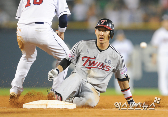 [엑스포츠뉴스=권혁재 기자] 26일 오후 서울 송파구 잠실야구장에서 열린 '2013 한국야쿠르트 세븐 프로야구' LG 트윈스와 두산 베어스의 경기, LG가 7-6으로 앞선 4회초 2아웃 1, 2루 LG 손주인이 2타점 적시 3루타를 날리고 3루에서 슬라이딩 세이프 되고 있다.