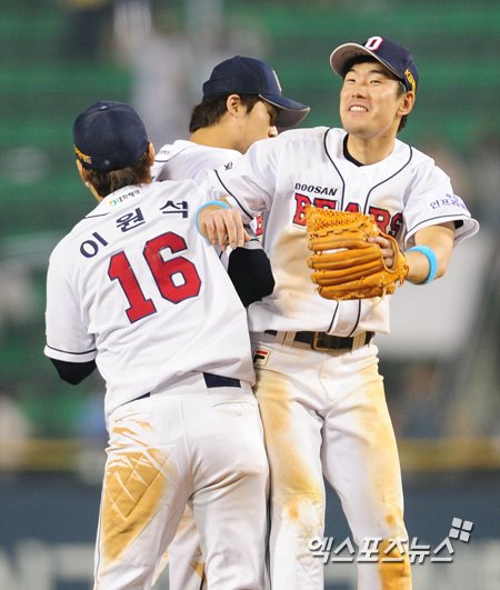 승리를 거둔 두산 오재원, 김재원, 이원석이 승리의 세리머니를 하고 있다.