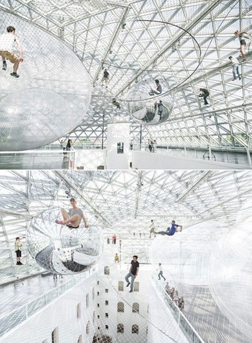 높이 20m 초대형 해먹 게시자는 사진 속 작품은 독일 뒤셀도로프 K21 박물관에 설치된 '인 오비트(궤도)'라고 설명했다. '인 오비트'는 강화 유리섬유와 강철 프레임으로 구성된 높이 20m 초대형 해먹이다.