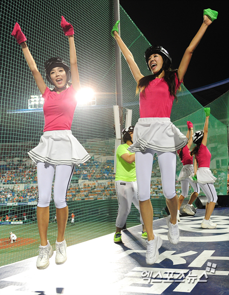 [엑스포츠뉴스=권혁재 기자] 31일 오후 서울 양천구 목동야구장에서 열린 '2013 한국야쿠르트 세븐 프로야구' 한화 이글스와 넥세 히어로즈의 경기, 넥센 치어리더들이 걸그룹 크레용팝 '빠빠빠' 직렬 5기통 댄스를 선보이고 있다.
