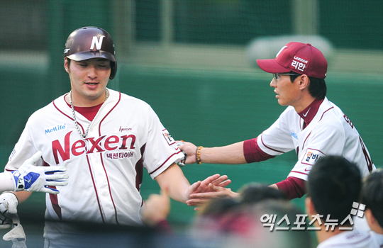 [엑스포츠뉴스=권혁재 기자] 1일 오후 서울 양천구 목동야구장에서 열린 '2013 한국야쿠르트 세븐 프로야구' 한화 이글스와 넥센 히어로즈의 경기, 2회말 1아웃 2루 넥센 강정호의 좌전안타에 홈을 밟은 2루주자 박병호가 염경엽 감독의 격려를 받고 있다.
