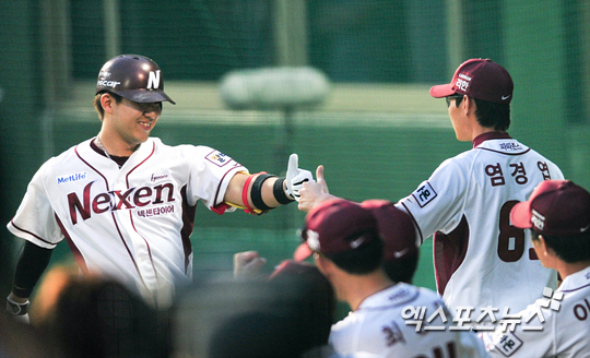 [엑스포츠뉴스=권혁재 기자] 1일 오후 서울 양천구 목동야구장에서 열린 '2013 한국야쿠르트 세븐 프로야구' 한화 이글스와 넥센 히어로즈의 경기, 넥센이 1-0으로 앞선 4회말 무사 만루 넥센 김민성이 좌중간 그랜드슬램을 날리고 들어와 염경엽 감독과 하이파이브 하고 있다. 김민성 4경기 연속 홈런에 개인통산 2호 만루홈런.