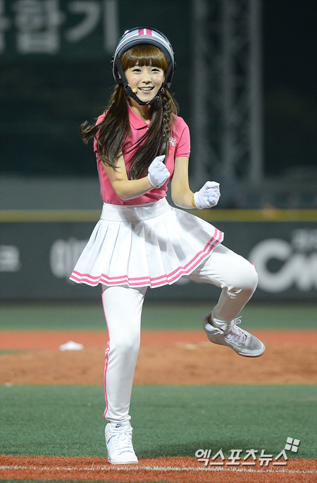 [엑스포츠뉴스=권혁재 기자] 1일 오후 서울 양천구 목동야구장에서 열린 '2013 한국야쿠르트 세븐 프로야구' 한화 이글스와 넥센 히어로즈의 경기, '직렬 5기통 댄스'로 사랑을 받고 있는 크레용팝이 그라운드에서 하프타임 공연을 펼치고 있다.