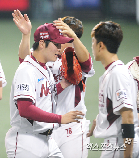 [엑스포츠뉴스=권혁재 기자] 1일 오후 서울 양천구 목동야구장에서 열린 '2013 한국야쿠르트 세븐 프로야구' 한화 이글스와 넥센 히어로즈의 경기, 넥센이 5-2로 앞선 8회초 2아웃 2, 3루 위기를 막아낸 넥센 투수 한현희가 동료들과 하이파이브 하고 있다.