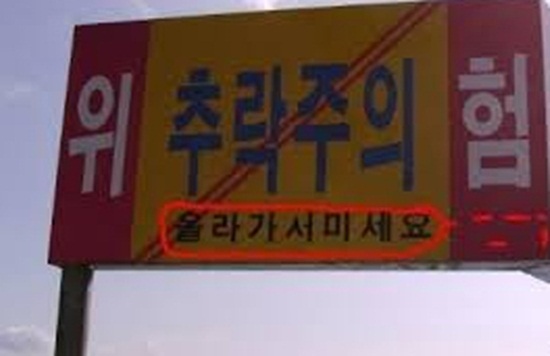 이는 '올라가지 마세요'라는 문구의 표지판이었으나, 일부가 훼손돼 '올라가서 미세요'라고 변형된 것으로 보인다.