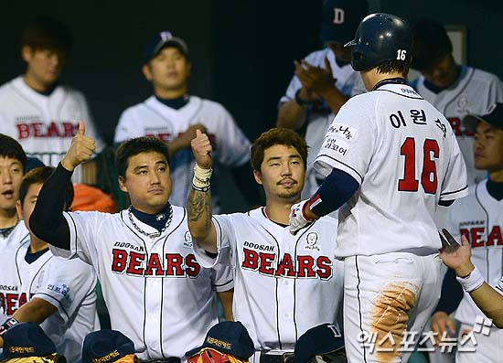 [엑스포츠뉴스 = 김성진 기자] 6일 오후 서울 잠실야구장에서 열린 '2013 한국야쿠르트 세븐 프로야구' 두산 베어스와 넥센 히어로즈의 경기에 2회 말 1사 만루 민병헌의 외야 희생플라이 때 홈을 밟은 3루주자 이원석에게 홍성흔과 오재원이 엄지손가락을 치켜세우고 있다.