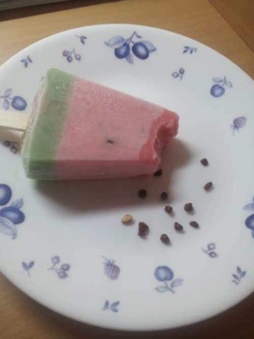 사진 속에는 수박 모양 아이스크림이 접시 위에 올려져 있다. 아이스크림 옆에는 수박씨 모양의 초콜릿이 정갈하게 발라져 있다. 진짜 수박씨처럼 생각해 초콜릿을 뱉어놓은 모습이 웃음을 자아낸다.