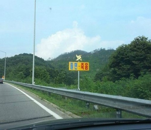 공개된 '도로공사의 돌직구' 사진은 도로를 달리는 차 안에서 찍힌 것으로 가드레일 위에 설치된 안내판에는 '졸면 죽음'이라고 적혀 있다.