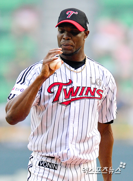 [엑스포츠뉴스=권혁재 기자] 9일 오후 서울 송파구 잠실동 잠실야구장에서 열린 '2013 한국야쿠르트 세븐 프로야구' 롯데 자이언츠와 LG 트윈스의 경기, LG 선발투수 레다메스 리즈(Radhames Liz | Radhames Corey Liz)가 투구에 앞서 공을 확인하고 있다.