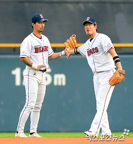 오재원-김재호 '아찔한 상황이었어'[포토]