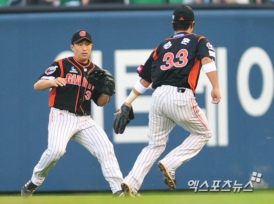 [엑스포츠뉴스=권혁재 기자] 13일 오후 서울 송파구 잠실야구장에서 열린 '2013 한국야쿠르트 세븐 프로야구' 롯데 자이언츠와 두산 베어스의 경기, 2회말 1아웃 두산 이원석의 뜬 타구를 롯데 우익수 손아섭과 2루수 정훈이 쫒아갔지만 잡아내지 못하고 있다.