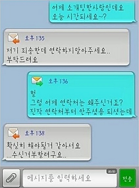 먼저 상대방은 "어제 소개팅한 사람인데요. 오늘 시간되세요?"라고 다시 만나고 싶은 마음을 나타냈다. 이에 연락을 받은 사람은 "저기 죄송한데 연락하지 말아주세요. 부탁드려요"라고 거절했다.