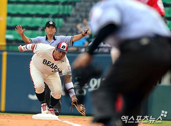 [엑스포츠뉴스 = 김성진 기자] 18일 오후 서울 잠실야구장에서 열린 '2013 한국야쿠르트 세븐 프로야구' 두산 베어스와 SK 와이번스의 경기에 2회 초 무사 박정권의 타구를 두산 1루수 최준석이 잡아내고 있다. 결과는 파울.