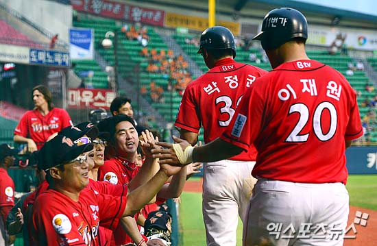 [엑스포츠뉴스 = 김성진 기자] 18일 오후 서울 잠실야구장에서 열린 '2013 한국야쿠르트 세븐 프로야구' 두산 베어스와 SK 와이번스의 경기에 3회 초 2사 만루 조인성의 3타점 적시 2루타 때 홈을 밟은 박정권과 이재원이 덕아웃에서 하이파이브를 하고 있다.
