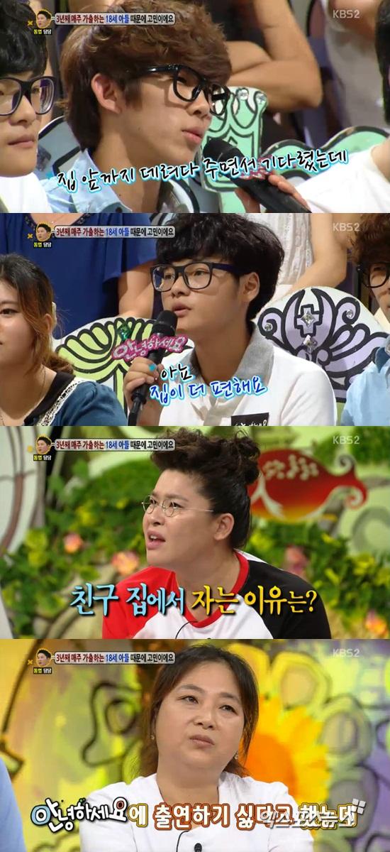 19일 방송된 KBS 2TV '안녕하세요'에 출연한 사연의 주인공은 "아들은 이제 고등학생인데 밥먹듯이 가출을 한다. 나갔다가 3일 후에 들어와서 어디 갔다 왔느냐고 물어보면 "왜?"라고 되묻는다"라고 고민을 털어놨다.