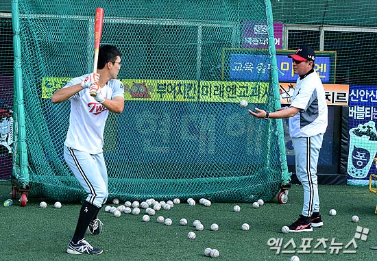 [엑스포츠뉴스 = 김성진 기자] 21일 오후 서울 목동야구장에서 열린 '2013 한국야쿠르트 세븐 프로야구' 넥센 히어로즈와 LG 트윈스의 경기에 앞서 LG 김기태 감독이 문선재에게 배팅볼을 던져주고 있다.