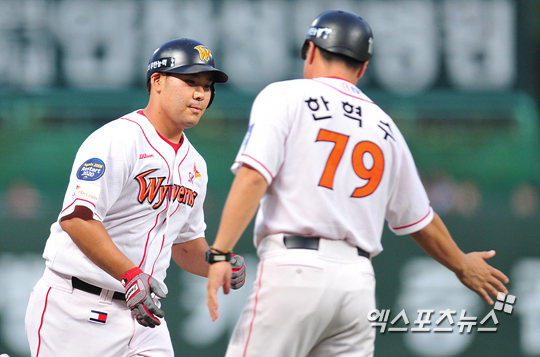 [엑스포츠뉴스=권혁재 기자] 22일 오후 인천 문학야구장에서 열린 '2013 한국야쿠르트 세븐 프로야구' LG 트윈스와 SK 와이번스의 경기, LG가 1-0으로 앞선 2회말 선두타자 SK 이재원이 우월 솔로포를 날리고 3루 코치와 하이파이브 하고 있다.