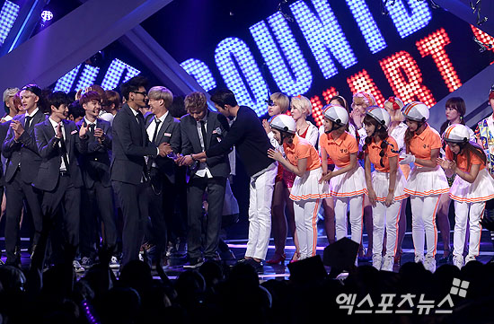 [엑스포츠뉴스 = 권태완 기자] 22일 오후 서울 상암동 CJ E&M에서 열린 Mnet '엠카운트다운' 방송에 EXO가 '으르렁'으로 1위를 차지하지 1위 후보였던 크레용팝이 축하인사를 하고 있다.