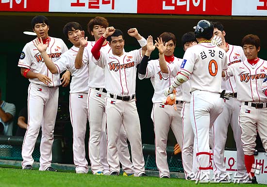 [엑스포츠뉴스 = 인천, 김성진 기자] 23일 오후 인천 문학야구장에서 열린 '2013 한국야쿠르트 세븐 프로야구' SK 와이번스와 LG 트윈스의 경기에 2회 말 1사 김강민이 선제 솔로 홈런을 터뜨린 후 덕아웃에서 동료들과 하이파이브를 하고 있다.